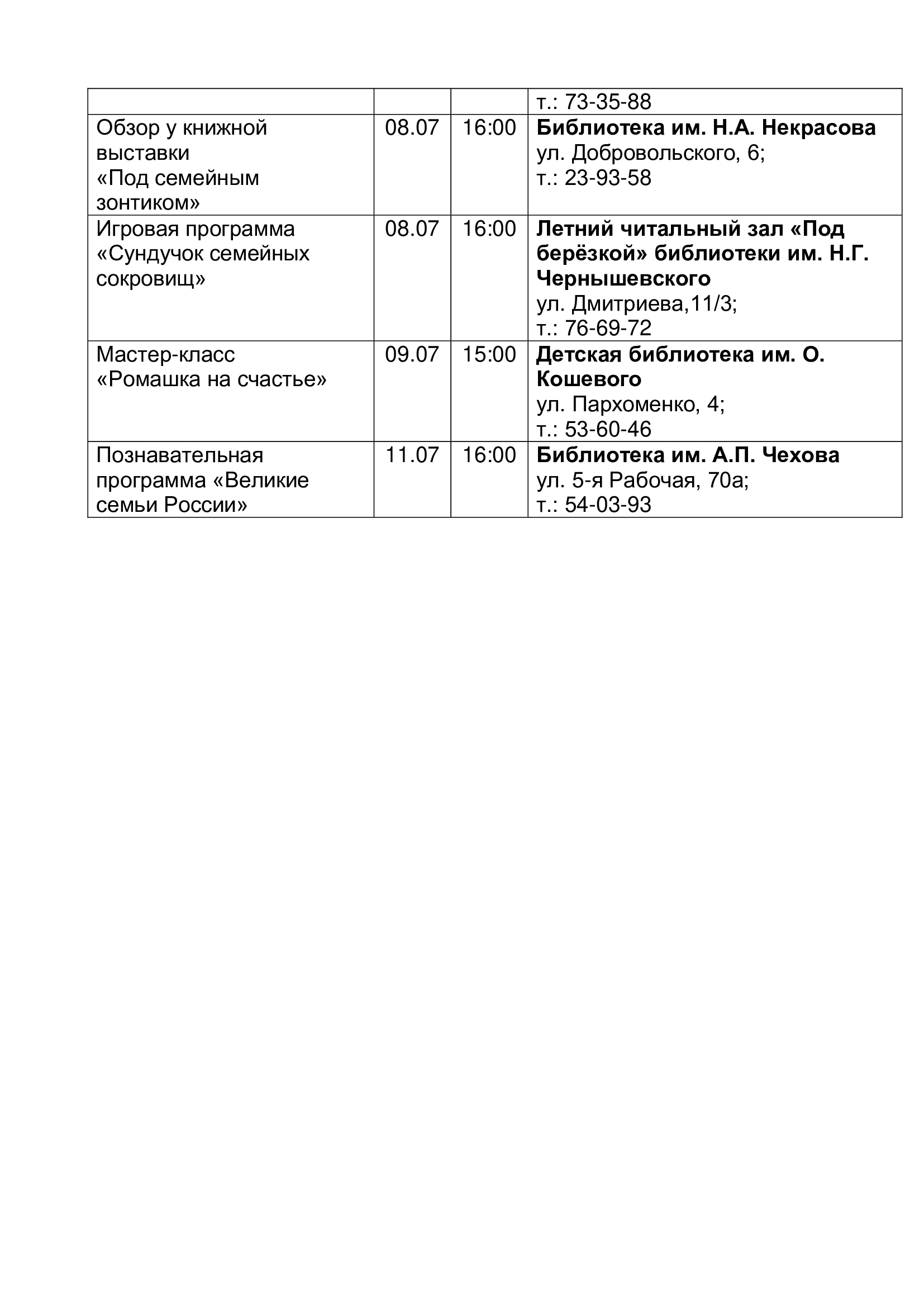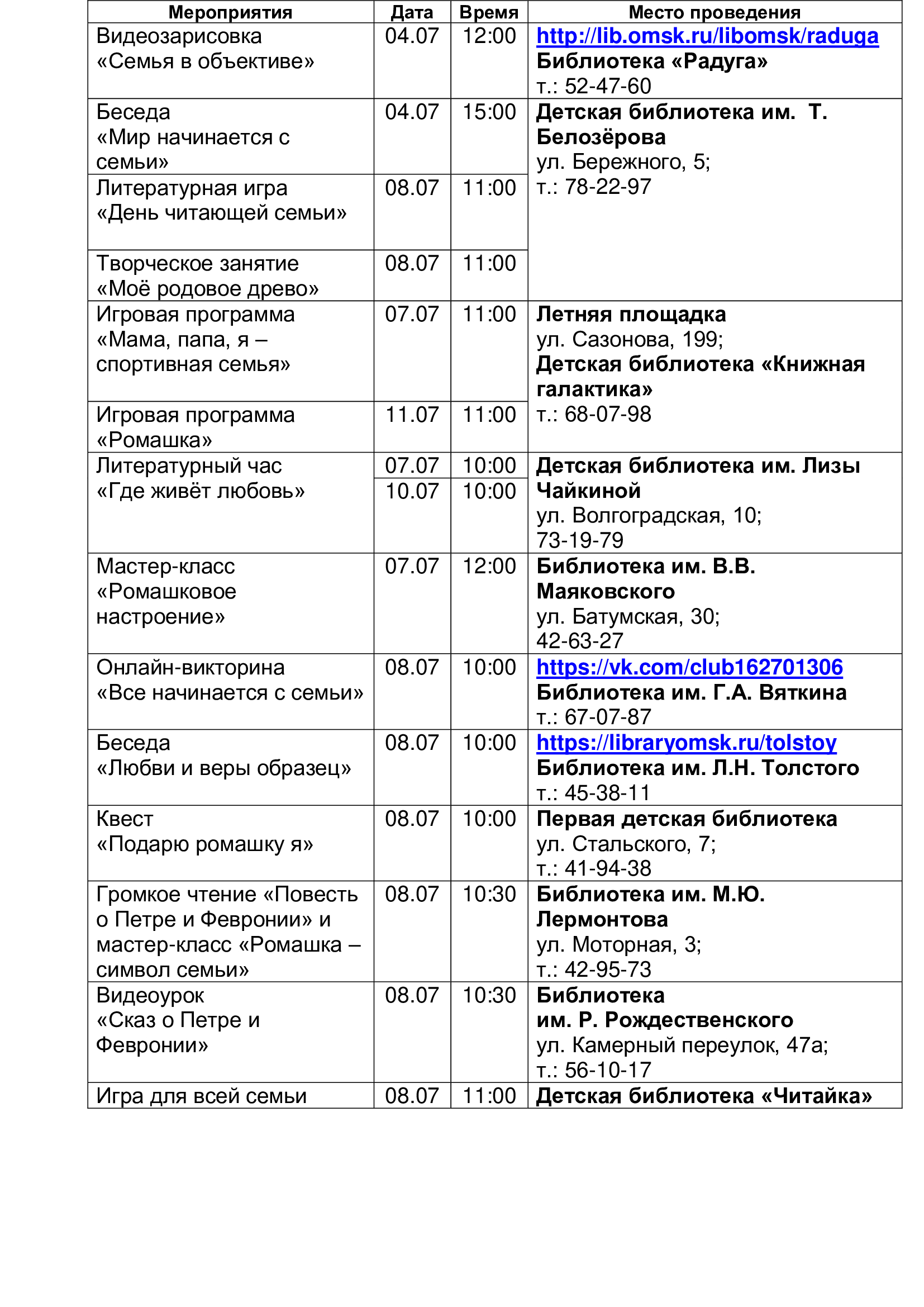 Омские муниципальные библиотеки подготовили для омичей насыщенную программу мероприятий, где каждый найдёт для себя занятие по душе. На творческих мастер-классах можно создать подарки своими руками для родных и близких. На беседах и викторинах узнать много нового и интересного об истории праздника, о покровителях семьи и брака Петре и Февронии, о традициях празднования Всероссийского дня семьи, любви и верности. Участие в семейных игровых программах и спортивных эстафетах, будет способствовать укреплению семейных отношений и взаимопониманию. Кроме того, муниципальные библиотеки подготовили мероприятия в онлайн-формате.
