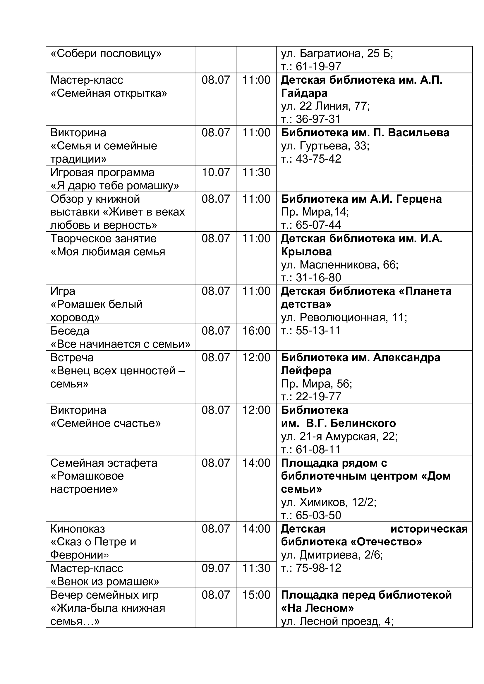 План мероприятий к Всероссийскому дню семьи, любви и верности