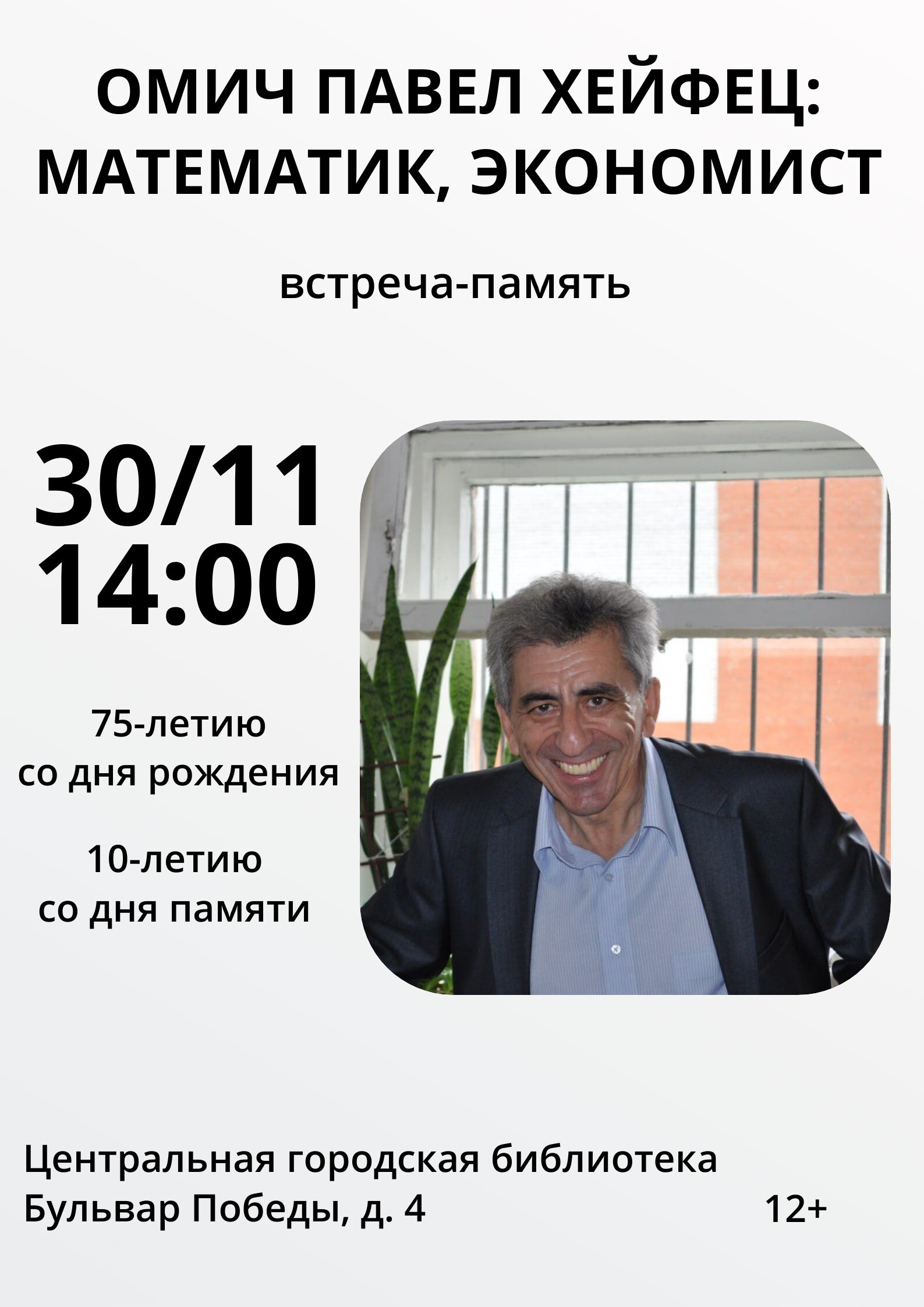 30 ноября в 14:00 отдел краеведения Центральной городской библиотеки (Бульвар Победы, 4; т.: 53-37-23) приглашает на встречу-память «Омич Павел Хейфец: математик, экономист».