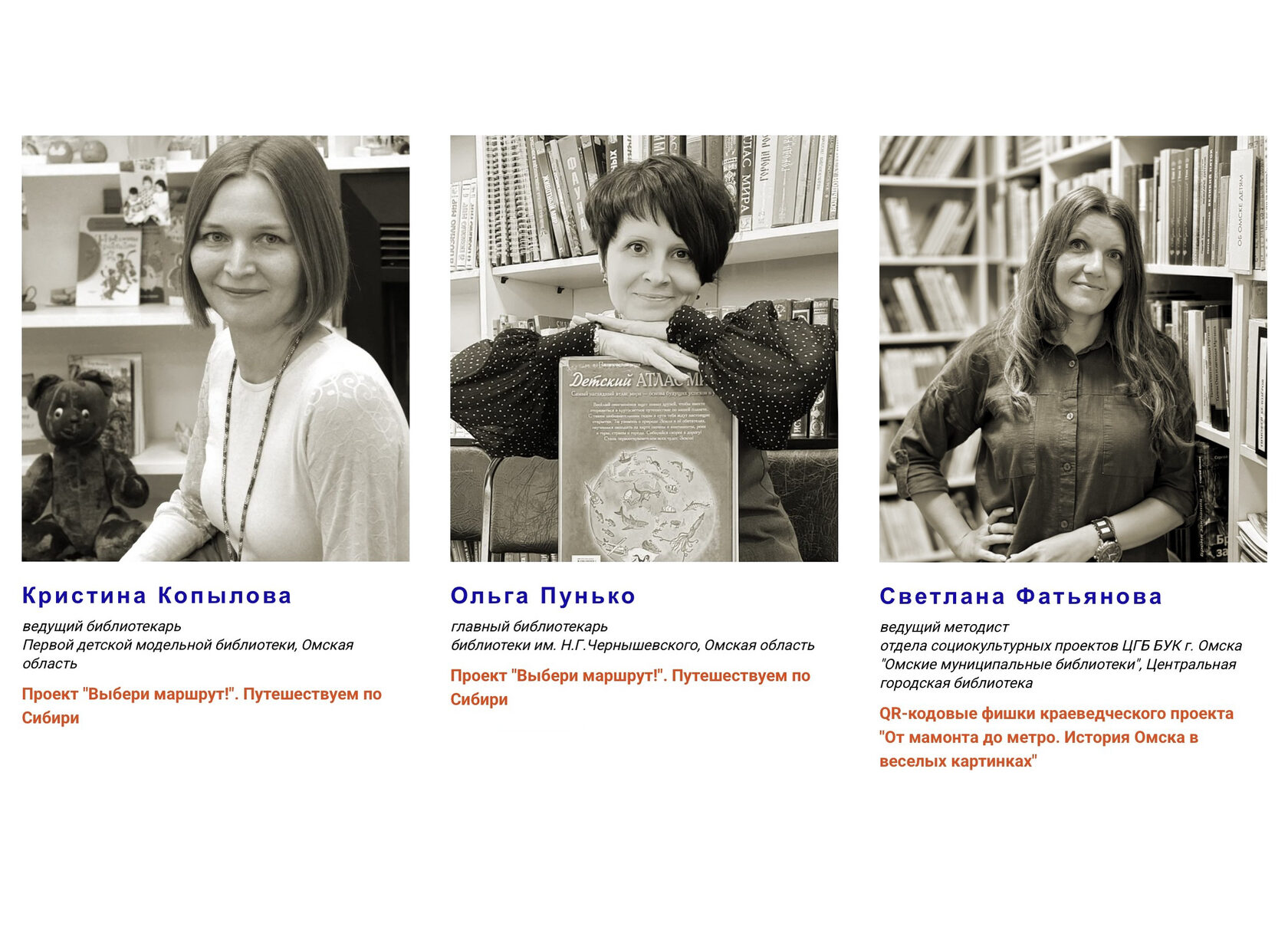 Кристина Копылова (Первая детская (модельная) библиотека) и Ольга Пунько (Библиотека им. Н.Г. Чернышевского) рассказали о проекте «Выбери маршрут!» Путешествуем по Сибири». Автор проекта – Елена Анатольевна Монахова, Центральная городская библиотека. На протяжении его реализации дети и подростки Омска знакомились с новыми художественными произведениями о родном крае – Сибири, путешествуя с книгами 25 авторов.