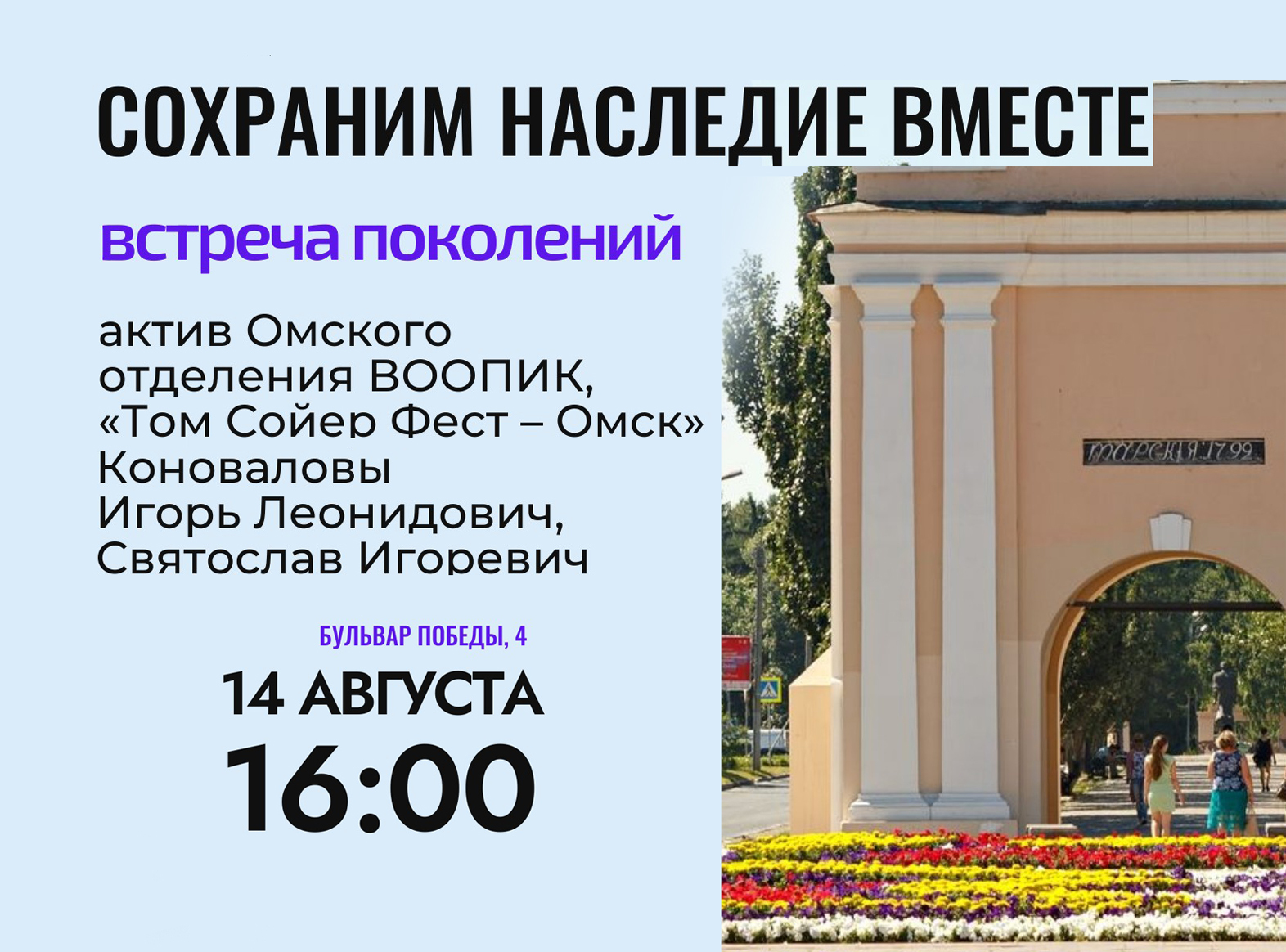В Центральной городской библиотеке (Бульвар Победы, 4; т.: 53-37-23) начинает работу новый краеведческий проект «Омские династии», который расскажет о представителях омских семей, где дети продолжают дело отцов и дедов, вносят вклад в общую событийную повестку нашего города. Первая встреча, гостями которой станут станут краеведы Игорь и Святослав Коноваловы, начнётся 14 августа в 16:00 часов. Тема встречи – «Сохраним наследие вместе!»